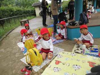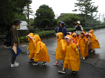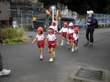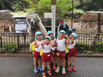 昨日、和田幼稚園といっしょに浜松市動物園に遠足に行きました。年長児は年6回の交流保育を進めており、園児たちは久しぶりに会えてとてもうれしそうでした。動物園ではヒツジやカンガルー、サル、トラ、クロヒョウ、フラミンゴ、ゴリラ、カピバラなど、いろいろな動物のいろいろな様子を見ることができ、園児たちは大興奮でした。途中で霧雨が降ってきましたが、計画通りに見学ができました。お昼はシロクマが見える広場にシートを広げて、和田幼稚園といっしょにお弁当やおやつを食べました。大きなバスに乗ってみんなで動物園に行った経験は、園児たちの遊びの世界をさらに広げてくれることと思います。