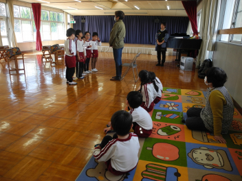 • 先週末、年長組と年少組の参観会とPTA奉仕作業がありました。年長組では絵本をもとに子どもたちが創作した劇を保護者の方に見ていただきました。多くのお客さんの前で緊張した様子でしたが、楽しく発表できました。年少組では保護者の方といっしょにコマや「大きなカブ」などをやって遊びました。みんなで力を合わせ、無事に大きなカブが抜けました。その後、保護者の方々が窓ガラスを磨いてくれ、保育室や遊戯室、絵本の部屋がとてもきれいになりました。