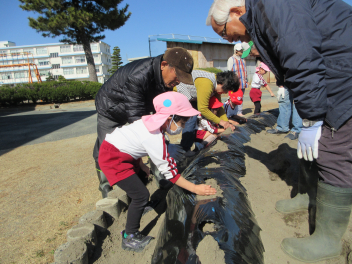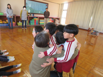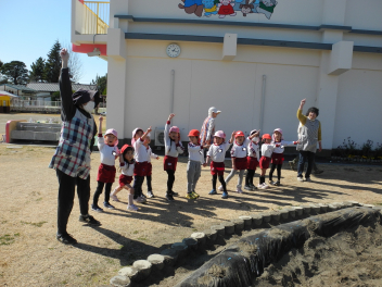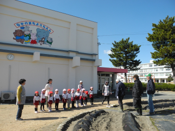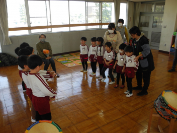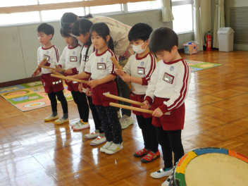 • 昨日、午前中には和太鼓引継ぎ会がありました。年長児はお世話になった太鼓の先生に和太鼓の演奏を披露し、お礼の言葉を伝え、手作りの花束を渡しました。その後、園で代々使われてきた太鼓のばちを年長児から年長児に渡しました。年長児は「大事に使ってね。」「がんばってね。」と年中児にエールを送っていました。午後には地域シニアボランティアの方々と年中児と年少児がジャガイモの種イモを園の畑に植えました。年中児が年少児を優しくリードする姿が見られ、1年の成長が感じられました。