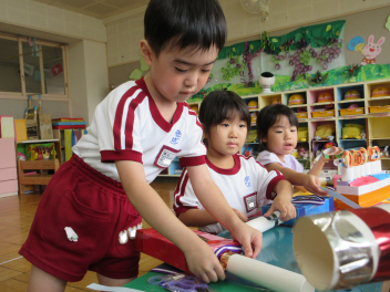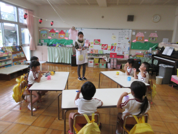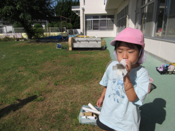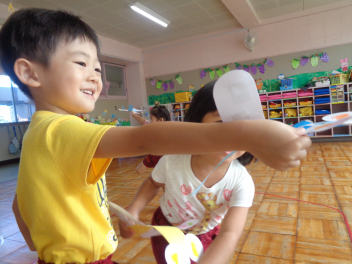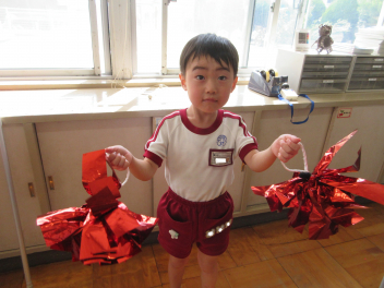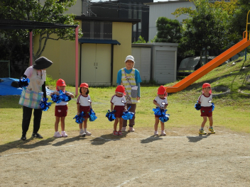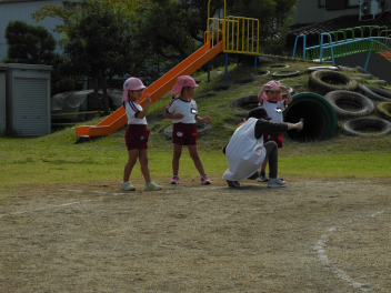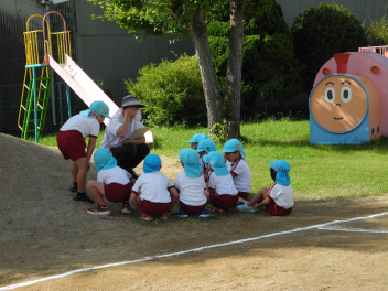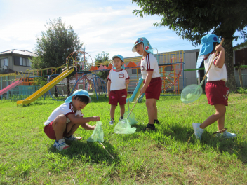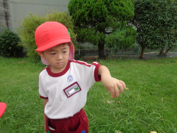 今週に入って秋らしくさわやかな日が続いています。日中は気温が高くなることもありますが、吹いてくる風に秋を感じます。園児たちはさわやかな風を受けて、体を動かすことがとても楽しそうです。年少組は、トンボやバッタ、チョウチョを追いかけたり、かけっこを楽しみました。年中組は未就園児種目のプレゼントを作ったり、大きなシャボン玉づくりに挑戦したりしました。年長組は何度もリレーをしたり、ボンボンをもってみんなでダンスをしたりしました。季節の移り変わりを五感で味わいながら、仲間と体を動かす喜びを感じているようでした。