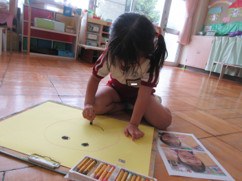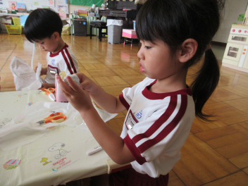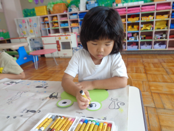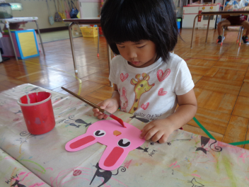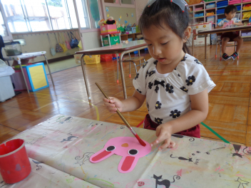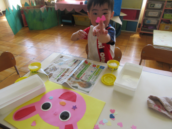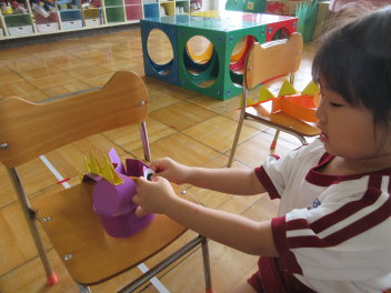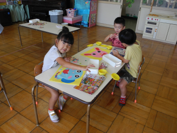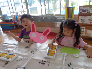 年少児は運動会で使うお面を作ったよ。