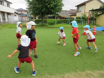 年長児は帽子とりで足腰を鍛えています。