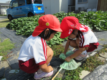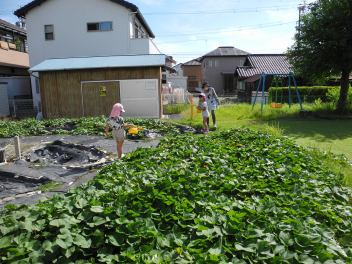 年中児はサツマイモ畑で虫探し。葉っぱがずいぶん広がったよ。