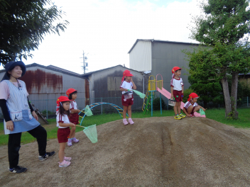 園庭にバッタが遊びに来たよ。網で捕まえたよ。