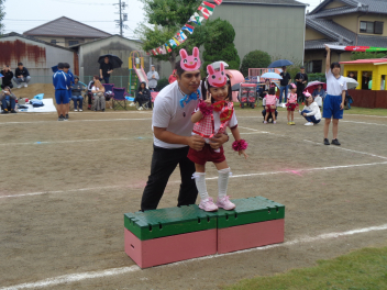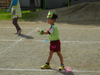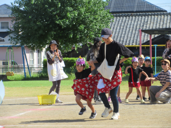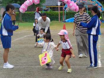 年中児の親子競技はデカパン競走。中学生チームには負けないぞ!