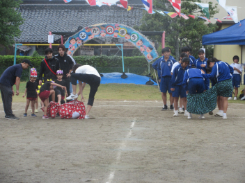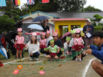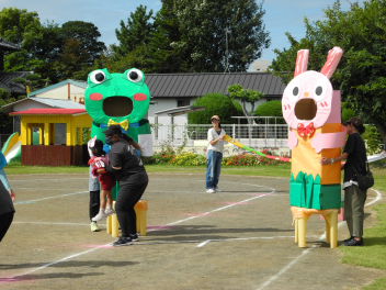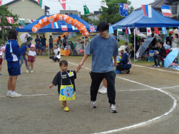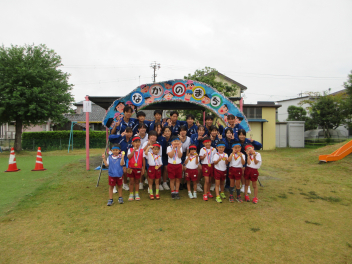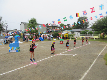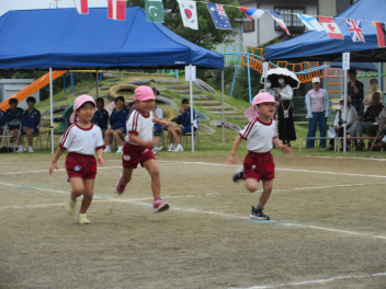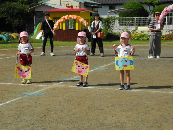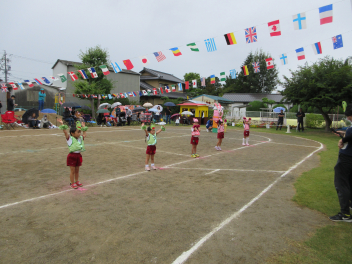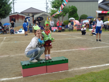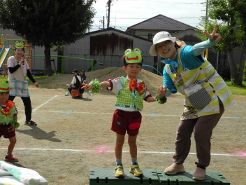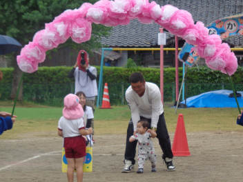 先週末、運動会がありました。地域のご来賓やご家族の方々に加え、地域ケアハウスのおじいちゃんやおばあちゃん、天竜中学校の生徒さんも応援に来てくださり、とても賑やかな運動会となりました。園児たちは雨にも負けず、全力でかけっこやダンス、親子競技に取り組んでいました。また、中学生ボランティアの生徒さんが準備や片付けはもちろん、デカパン競走に参加したり、熱心に応援してくれたりし、運動会を盛り上げてくれました。