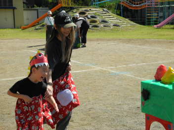 年長児の帽子取り。おうちの方におんぶしてもらって、右へ、左へ。