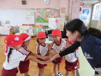 年少児もみんなで手を重ねて「がんばるぞー!」