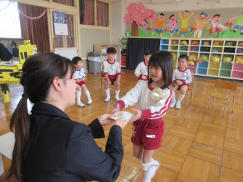 昨日、お別れ会を行いました。年中児と年少児は、この会に向けてがんばってプレゼントを作ったり、会の練習をしたりしました。当日の会の進行も立派にでき、「ありがとう」の気持ちが年長児に伝わっているようでした。年長児からは「さくら さくら ようちえん」歌のプレゼントがありました。互いの心が通じ合って、とても温かな会になりました。