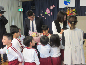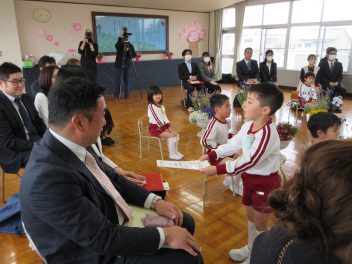 • 昨日、午前中には和太鼓引継ぎ会がありました。年長児はお世話になった太鼓の先生に和太鼓の演奏を披露し、お礼の言葉を伝え、手作りの花束を渡しました。その後、園で代々使われてきた太鼓のばちを年長児から年長児に渡しました。年長児は「大事に使ってね。」「がんばってね。」と年中児にエールを送っていました。午後には地域シニアボランティアの方々と年中児と年少児がジャガイモの種イモを園の畑に植えました。年中児が年少児を優しくリードする姿が見られ、1年の成長が感じられました。
