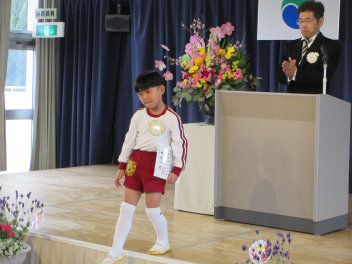 年長児さんの入場!椅子に名札メダルをつけたんだよ。