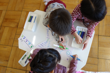 どんな鯉のぼりにしたいかを3人で相談しながら設計図を書いていきます