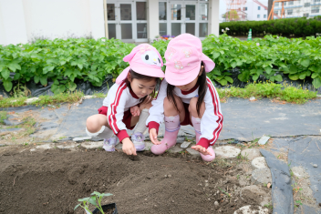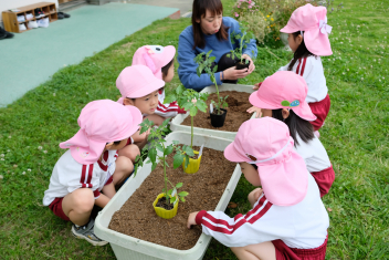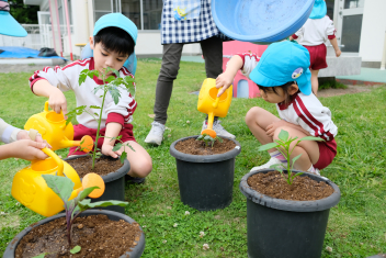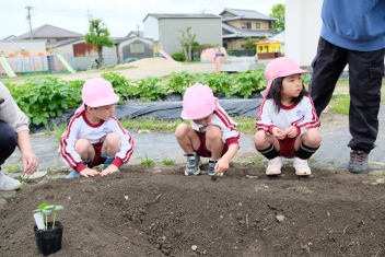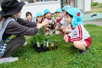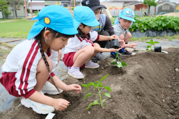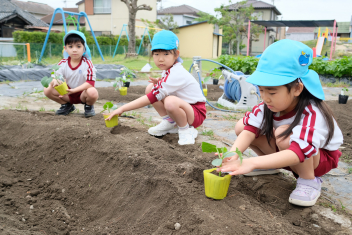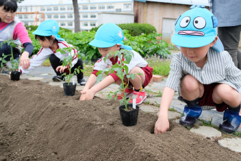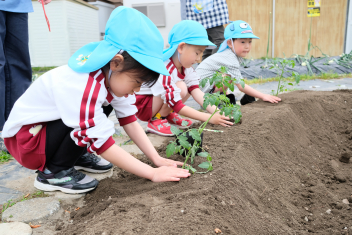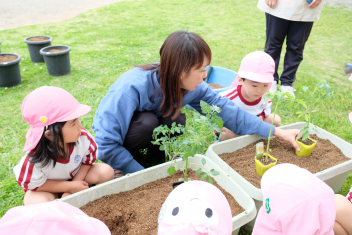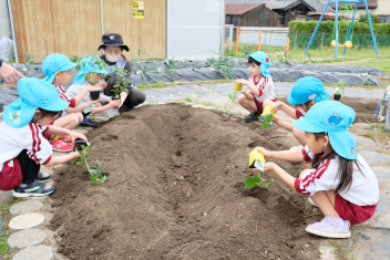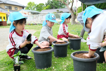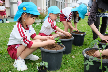 年長さんは自分の好きな野菜の苗を一つずつ鉢にも植えました