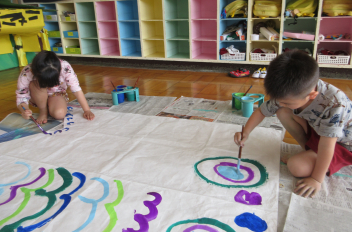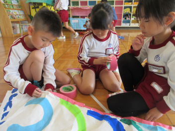友達と一緒にじっくりとこいのぼり作りに取り組む年長さんでした