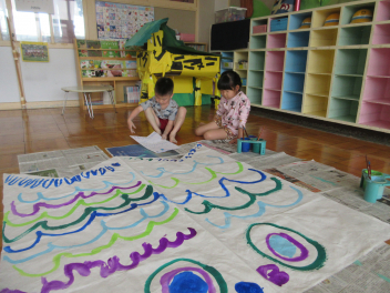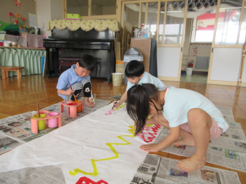 年長さんが先日完成した設計図を見ながら、こいのぼりに模様を描きました