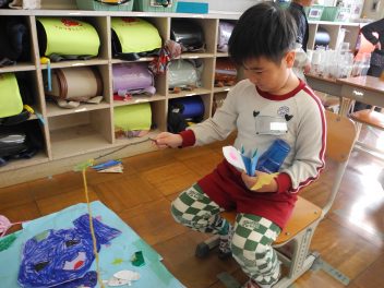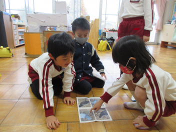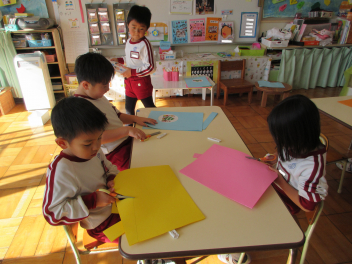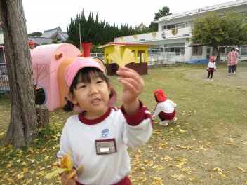 昨日から今季一番の寒気がやってきました。子どもたちも手袋や厚手のジャンパーを身につけて登園するようになりました。また、強い北風のせいで園庭の木々からは大量の落ち葉が降ってきました。そんな寒い日であっても外での遊びが大好きです。