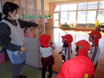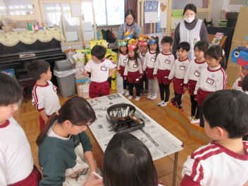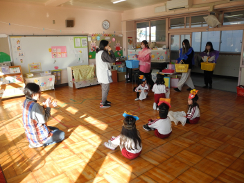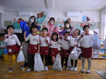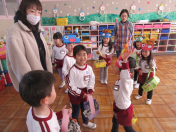 昨日、節分の豆まき行事を行いました。園児たちは1週間ほど前から鬼がやってこないようにヒイラギやイワシを幼稚園に持ってきたり、新聞紙で作った豆をたくさん用意していました。鬼がやってくると、園児たちは「鬼は外!」と叫びながら新聞紙で作った豆を大きな鬼たちに投げつけ、追い払いました。その後、福の神がやってきて、大好きなお菓子をまいてくれ、みんなで拾いました。園児たちは「少し怖かったけどとても楽しかった。」と話し、とても満足そうでした。