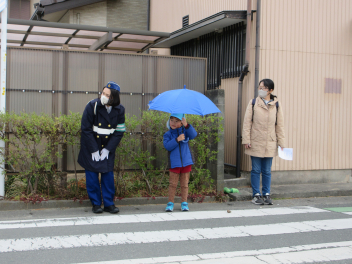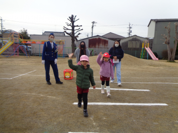 先週末、交通指導員の方をお迎えし、親子交通安全教室を行いました。年少児と年中児は道路の歩き方や横断歩道の渡り方などを教えてもらい、その後、園庭に作った道路で確認しました。年長児は道路の歩き方に加え、傘を使うときの安全な歩き方を教えてもらい、その後、実際に園周辺の道路を歩いてみました。保護者の方には安全な歩き方ができているのか園児の後ろから見てチェックしてもらいました。