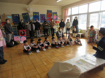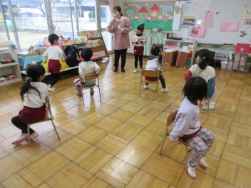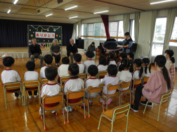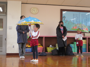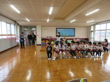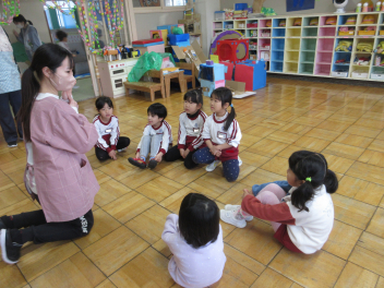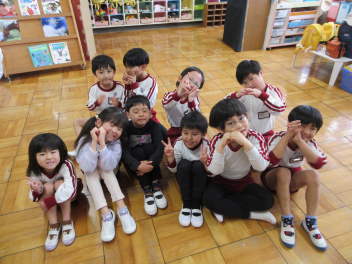 • 先週末、年長組と年少組の参観会とPTA奉仕作業がありました。年長組では絵本をもとに子どもたちが創作した劇を保護者の方に見ていただきました。多くのお客さんの前で緊張した様子でしたが、楽しく発表できました。年少組では保護者の方といっしょにコマや「大きなカブ」などをやって遊びました。みんなで力を合わせ、無事に大きなカブが抜けました。その後、保護者の方々が窓ガラスを磨いてくれ、保育室や遊戯室、絵本の部屋がとてもきれいになりました。