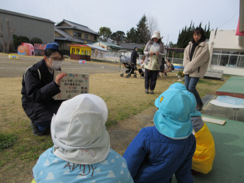• 昨日、午前中には和太鼓引継ぎ会がありました。年長児はお世話になった太鼓の先生に和太鼓の演奏を披露し、お礼の言葉を伝え、手作りの花束を渡しました。その後、園で代々使われてきた太鼓のばちを年長児から年長児に渡しました。年長児は「大事に使ってね。」「がんばってね。」と年中児にエールを送っていました。午後には地域シニアボランティアの方々と年中児と年少児がジャガイモの種イモを園の畑に植えました。年中児が年少児を優しくリードする姿が見られ、1年の成長が感じられました。