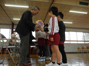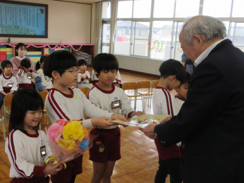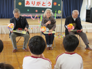 • 昨日、田んぼの活動でお世話になっている地域シニアボランティアの方に感謝する「ありがとうの会」を行いました。和田幼稚園の年長・年中組の園児といっしょに、お礼の言葉を伝えたり、手作りの花束を渡したり、感謝の歌を歌ったりして感謝の気持ちを伝えました。シニアボランティアの方々からは「小学校に入ってもがんばるように」と励ましの言葉をいただきました。会の後、学年ごとに遊んだり、プレゼントの交換をしたりしました。