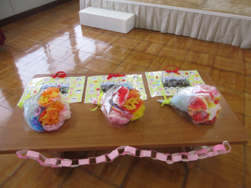• 昨日、年中組の保護者参観会を行いました。園児たちはみんなで練習した獅子舞を披露したり、サンドイッチ屋さんやゲーム屋さんに招待したり、いっしょにコマで遊んだりしました。お母さんがお客さんになってくれたので、いつもより張り切って遊んでいました。最後にはいつものお礼の気持ちを込めてお母さんに金メダルをかけてあげました。