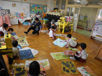 • 先週から生活発表会の準備が始まりました。年中児や年長児は劇ごっこをしたり、小道具や背景などを作ったり、楽器を使ってリズム遊びをしたりしました。年少児は画用紙でサツマイモカレーを作ったり、園庭でオオカミさんをして遊んだり、歌を歌ったりしました。生活発表会に向けて、子どもそれぞれの思いを大事にしながら支援していきたいと思います。