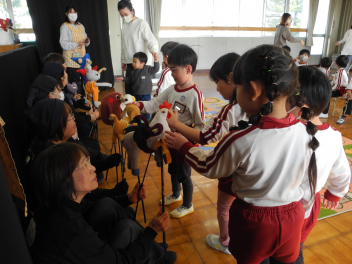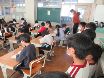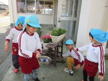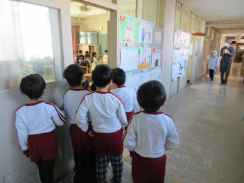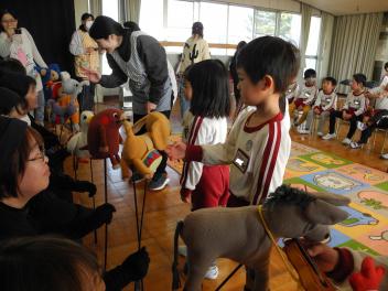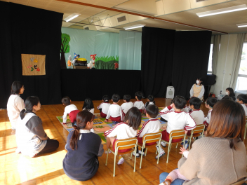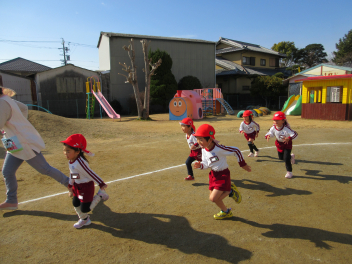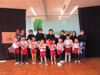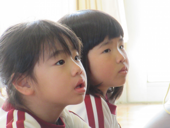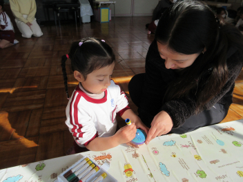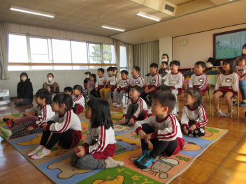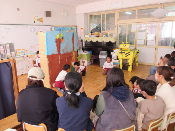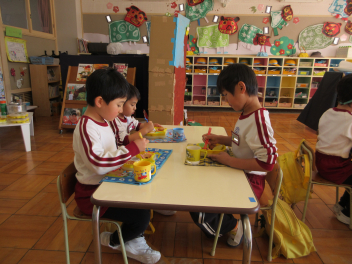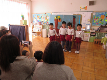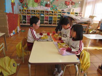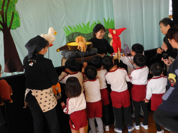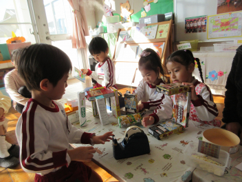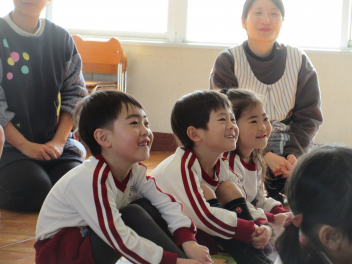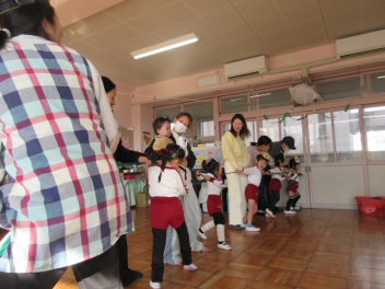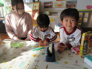昨日、節分の豆まき行事を行いました。園児たちは1週間ほど前から鬼がやってこないようにヒイラギやイワシを幼稚園に持ってきたり、新聞紙で作った豆をたくさん用意していました。鬼がやってくると、園児たちは「鬼は外!」と叫びながら新聞紙で作った豆を大きな鬼たちに投げつけ、追い払いました。その後、福の神がやってきて、大好きなお菓子をまいてくれ、みんなで拾いました。園児たちは「少し怖かったけどとても楽しかった。」と話し、とても満足そうでした。