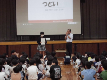 • 10月1日、体育館に全校児童が集まって『つどい』が行われました。
