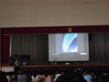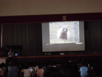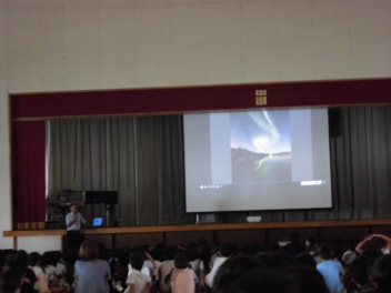 校長先生が実際に撮影をした「自然の風景」や「オーロラ」、「動物たち」の写真。それらはすべてアラスカの現地で実際に撮影されたものでした。特に「オーロラ」の写真がスクリーンいっぱいに映し出されると、その神秘的な美しさに体育館のいたるところから感嘆の声が漏れあふれていました。実際の写真は校内のどこかに展示中です。探してみてくださいね。