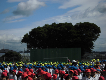 子供たちは、4色の帽子をかぶり総練習に臨みました。