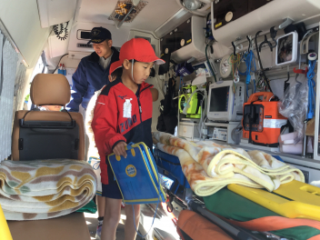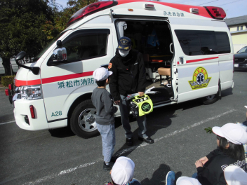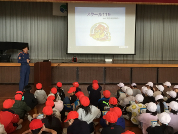 浜北消防署赤佐出張所の皆様が来校され、3年生を対象に「スクール119」の講座を行っていただきました。子供たちは、タンク車の見学や防火衣、酸素ボンベなどを持たせてもらう体験を行ったり、救急車の中に入り、ストレッチャーやAEDなどを見せていただいたりしました。体育館では、外で見学したタンク車の他に、はしご車やポンプ車、消防ヘリコプターなどを紹介していただきました。