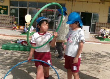 異年齢児の交流を通して、年中児は年少児への声の掛け方や関わり方を考えますlaugh