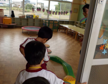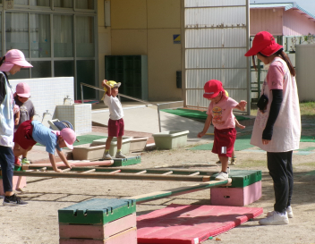 先生と一緒に平均台を歩いたり、巧技台からジャンプしたりして、遊ぶ子もいましたlaugh