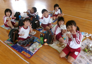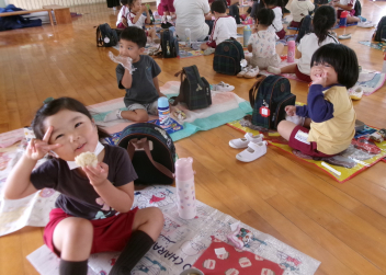 おにぎり弁当は、全園児で食べましたindecision先生たちもみんな遊戯室に集まって、楽しくおにぎりを食べました