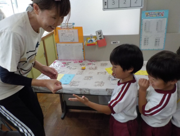 友達に教えてもらう場面が見られました先生から教えてもらうだけでなく、子供同士が関わる場面も大切にしています。