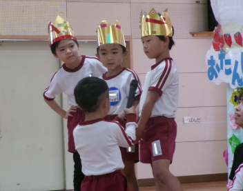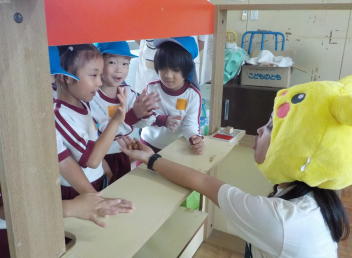 • 年中児がつくった『お祭り屋さん』。今日は年少児が招待され、保育室内はお客さんでいっぱいになりましたfrown
