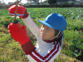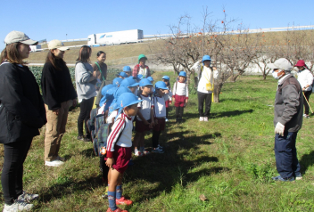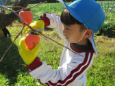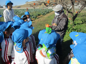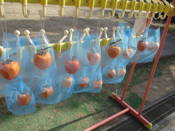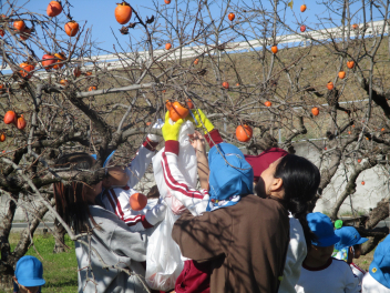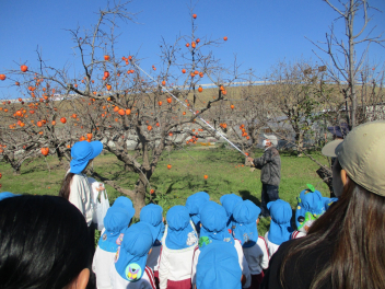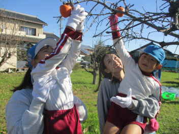 早速、柿を採りました。届く所は自分で採りました。高いところは枝を下げてもらったり、参加保育の方や先生に抱っこをしてもらって採りました