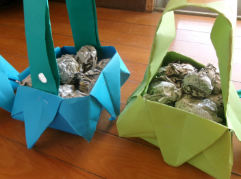 各クラスでつくった角こう箱と新聞豆です。鬼をやっつけるために、準備してきました