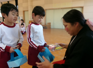 年長鬼は、年中ぱんだ組と年少りす組に登場紙袋をベースにつくった鬼の被り物・・・いろいろな表情の鬼がいて子供たちは少し怖かったかな??