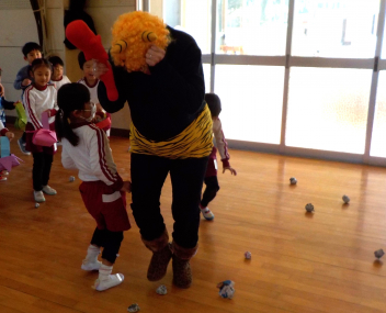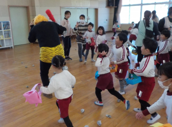 その後は、先生が鬼のお面を被って、豆まきごっこが始まりました。新聞紙を丸めてつくった豆を『先生鬼』に向かって投げます