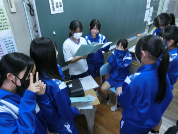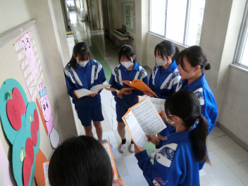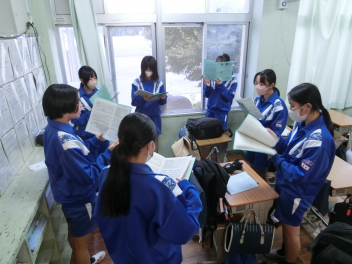放課後の職員室、明日行われるスピーチコンテスト県大会に出場する3年生小楠さんが職員の前でリハーサルを行っていました。
