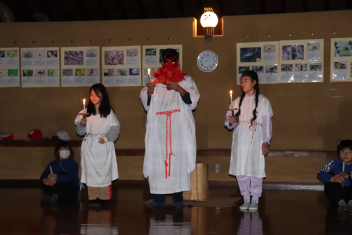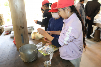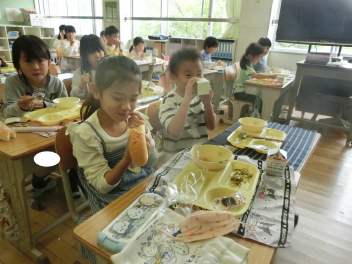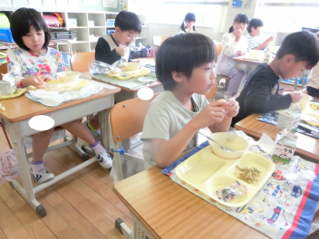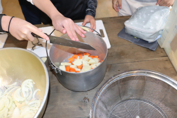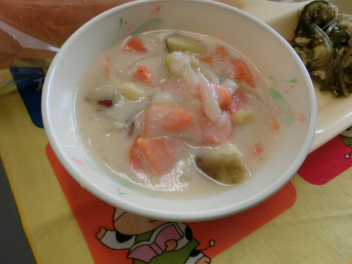 シチューというと、じゃがいもが入 っているのが定番 ですが、今日 はさつまいもで作 りました。さつまいもの旬 は、8 月~11月 ごろです。さつまいもは、収穫後 、2~3か月 ほどおいておくと、水分 がぬけて、甘 くおいしくなります。今日 のシチューは、いつものシチューより甘 い味 に仕上 がっています。じゃがいもよりやわらかいので、食 べた時 の食感 も違 いますね。味 や食感 の違 いを感 じながらいただきましょう。