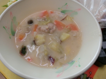 また、だしを味 わう献立 として、かきたま汁 を用意 しました。だしの味 をあじわっていただきました。