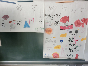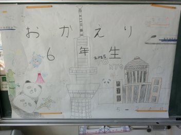 6年生が、修学旅行から帰ってきたら、教室の黒板に「おかえりなさい」「修学旅行はたのしかった?」というメッセージがはってありました。西小では、5年生がかわな野外活動センターから帰ってきたときは、6年生が「おかえりなさいのメッセージ」、6年生が修学旅行から帰ってきたときは、5年生からメッセージということが続いています。子供たちの優しさを感じる活動です。