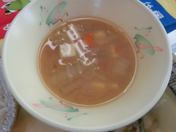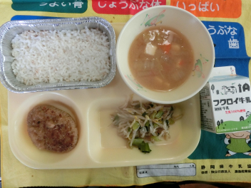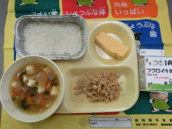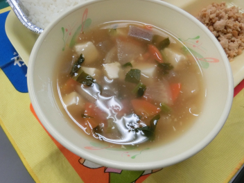 今日 はエネルギーになる食 べ物 の「炭水化物 」について紹介 をします。炭水化物 には、体 を動 かしたり、勉強 したりするのに必要 なエネルギーをつくる大切 な栄養素 です。食 べ物 では、ごはんやパン、うどんのほかに、いも類 にも多 くの炭水化物 が含 まれています。いも類 には、おなかの調子 を整 える食物繊維 や、肌 を元気 にする働 きのあるビタミンCが多 く、同時 にいろいろな栄養 がとれる優 れた食 べ物 です。今日 ののっぺい汁 にはさといもが入 っています。