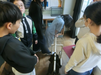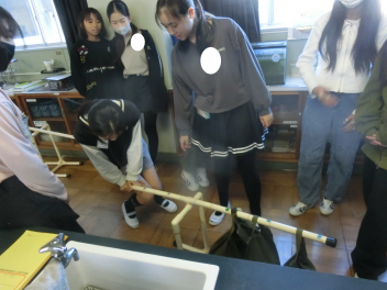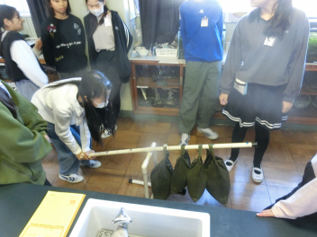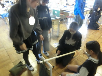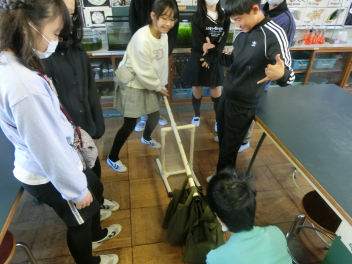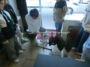 • 11月26日(水)6年生が、理科「てこのはたらき」の学習で、てこの実験道具を使って、「力点」「支点」「作用点」の条件を変えて、どうやったら10kgのおもりをできるだけ少ない力で持ち上げることができるか調べていました。