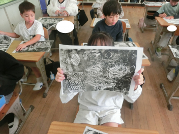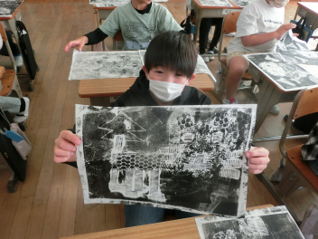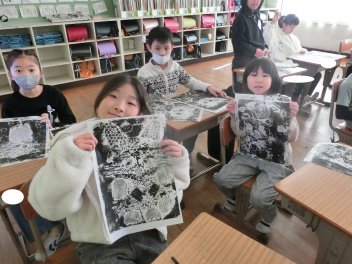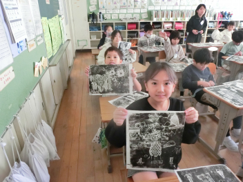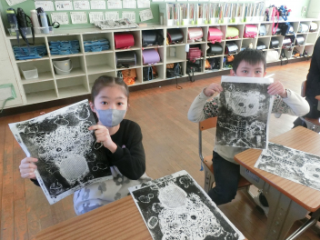 • 11月27日(木)3年生が、図画工作科「はんが」の授業で、版画をすりました。出来上がった作品に満足している子がたくさんいました。次回裏から色をつけて完成させていく予定です。