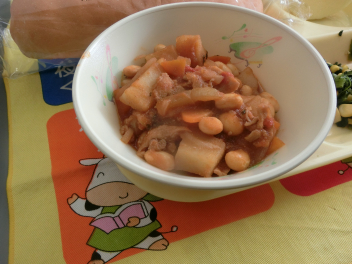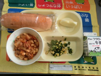 今日 のくだものはりんごです。りんごは一年中食 べることができますが、秋 から冬 にかけてとれるくだものです。日本 でりんごが本格的 に栽培 されるようになったのは、明治時代 に入 ってからのことです。寒 い地域 の青森県 や、岩手県 で栽培 されています。りんごにたくさん含 まれている「ペクチン」という食物 せんいには、おなかの調子 を整 えるはたらきがあります。おなかの調子 が悪 い時 には、すりおろして食 べるとよいです。一年 で一番 おいしい時期 のりんごを味 わいましょう。