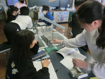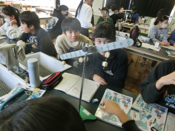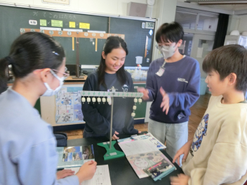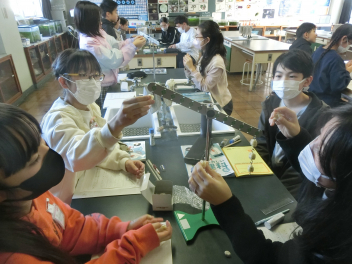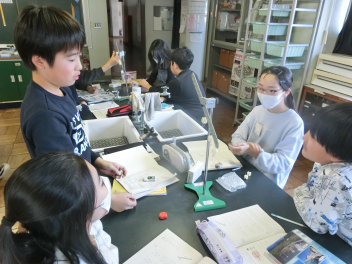 • 12月1日(月)6年生が、理科「てこのはたらき」の授業で、実験用てこで、左のうでと右のうでに重りをつるして水平につり合うきまりを見つけていました。グループの友達と協力して、実験して、きまりの式を考えていました。